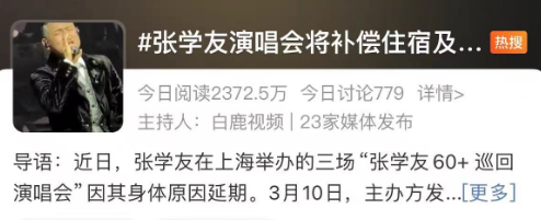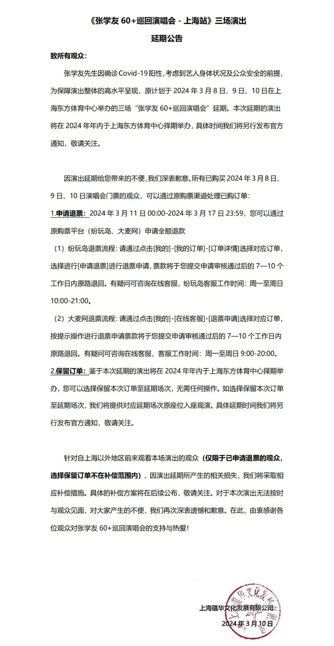 3月10日,主办方@CMCLive华人文化演艺 发布《张学友60+ 巡回演唱会-上海站》的延期公告及补偿公告,表示本次延期的演出将在2024年年内于上海东方体育中心择期举办。