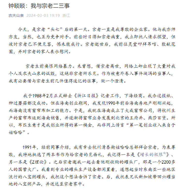 3月3日,农夫山泉方面对此作出回应,其官方微博发布了《钟睒睒:我与宗老二三事》。农夫山泉创始人钟睒睒“借与宗老生前几件值得追忆的往事”,澄清网络钟睒睒个人及农夫山泉的传闻