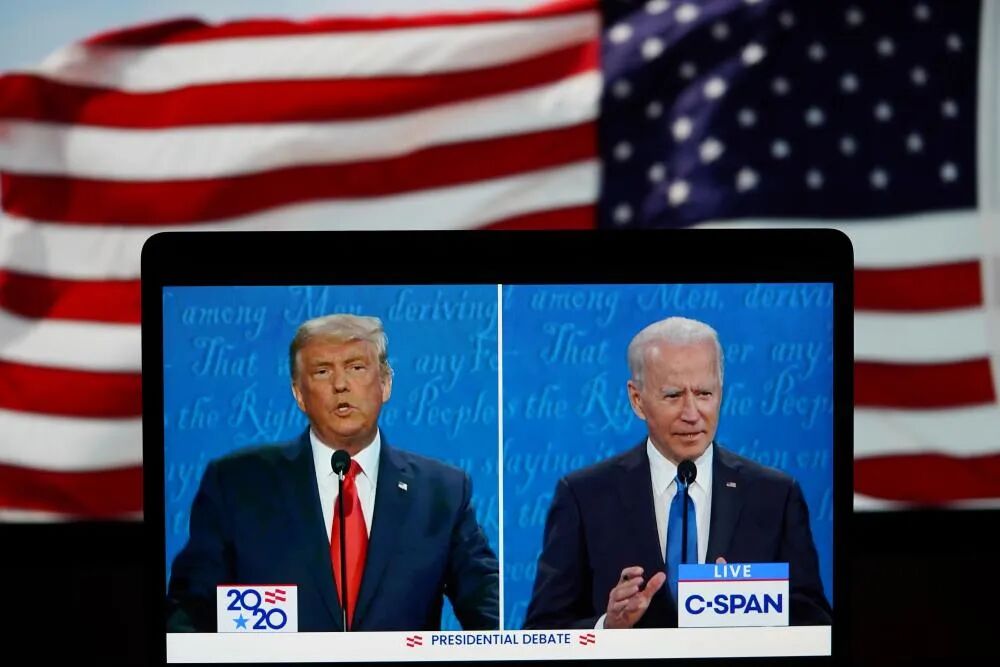 这张2020年10月22日在美国弗吉尼亚州阿灵顿拍摄的视频画面显示,时任美国总统特朗普(左)与当时的民主党总统候选人拜登在田纳西州纳什维尔市参加最后一场总统候选人电视辩论。新华社记者 刘杰 摄