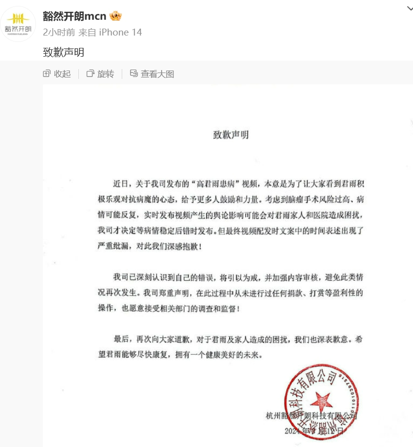 随后,“点读机女孩”所属MCN机构杭州豁然开朗科技有限公司发布致歉声明称,关于该司发布的“高君雨患病”视频,最终视频配发时文案中的时间表述出现了严重纰漏,对此深感抱歉。公司声明称,在此过程中从未进行过任何捐款、打赏等盈利性的操作,愿意接受相关部门的调查和监督。