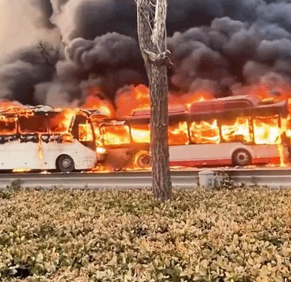据“平安东丽“微信公众号消息,今天(3月15日)6时35分,在天津东丽区津汉公路东向西24.2公里处,一辆大客车追尾一辆因故障停靠路边的公交车,引发两车起火。