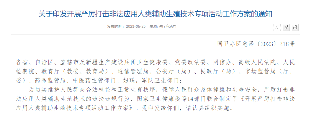 据悉,2023年6月,国家卫生健康委、中央政法委等14部门联合制定了《开展严厉打击非法应用人类辅助生殖技术专项活动工作方案》,该方案将切实维护人民群众合法权益和正常生育秩序,保障人民群众身体健康和生命安全,严厉打击从事人类辅助生殖技术活动、代孕、伪造或买卖出生证明等行为。