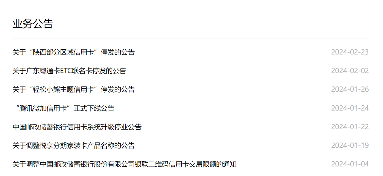 除了浙江民泰银行之外,今年以来,还有多家银行发布停止发行部分联名信用卡的公告。比如,邮储银行停发广东粤通卡ETC联名卡;中信银行停发腾讯和平精英联名信用卡、家乐福联名信用卡;长沙银行停发京东金融联名信用卡、京东金融爱奇艺联名信用卡、京东金融出行联名信用卡等。对于停发原因,多家银行在公告中解释为“业务策略调整”“合作期满”等。