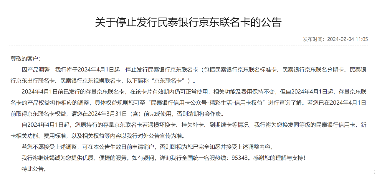 根据浙江民泰银行发布的公告,该行将于2024年4月1日起,停止发行民泰银行京东联名卡(包括民泰银行京东联名标准卡、民泰银行京东联名分期卡、民泰银行京东出行联名卡、民泰银行京东视娱联名卡)。