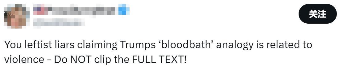 另一方面,一些特朗普的支持者则抨击民主党人断章取义。有人说:“你们这些左翼(民主党)声称特朗普的‘屠杀’与暴力有关——别断章取义!”