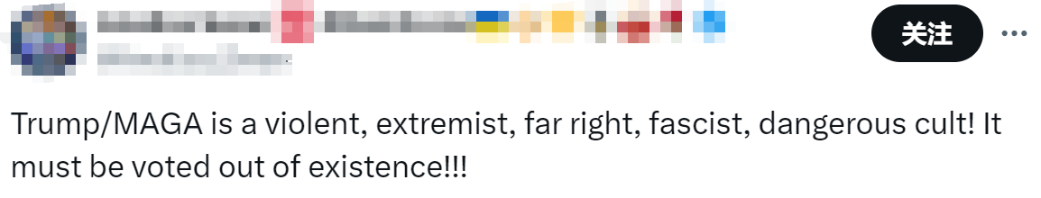 有人喊话:“特朗普/MAGA(即让美国再次伟大口号)是一个暴力的、极端的、极右翼的、法西斯的、危险的邪教!一定要用投票让它不复存在!!!”