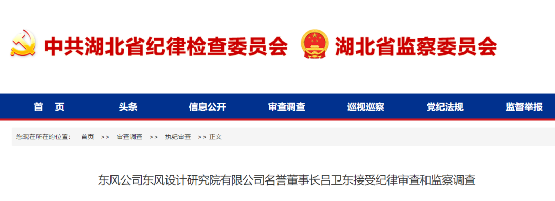 据东风公司纪委、湖北省纪委监委消息:东风公司东风设计研究院有限公司名誉董事长吕卫东涉嫌严重违纪违法,目前正接受东风公司纪委和湖北省恩施土家族苗族自治州鹤峰县监委纪律审查和监察调查。