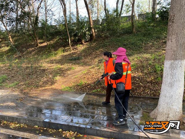上午9点半,在荆州大学城中央公园路段,多名环卫工人正利用冲洗枪、扫帚等工具开展环境清扫工作。