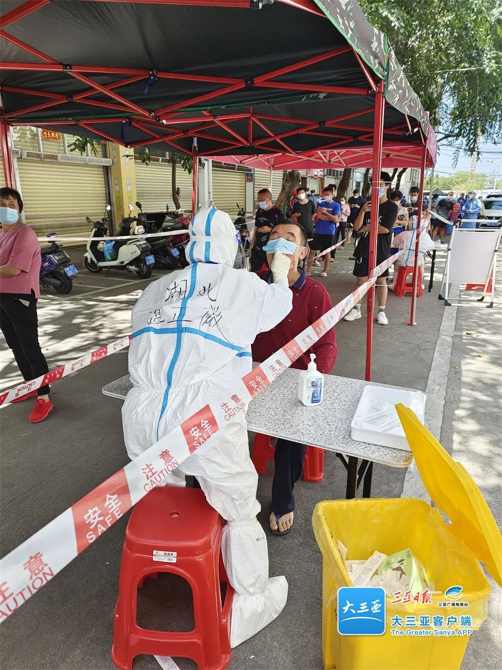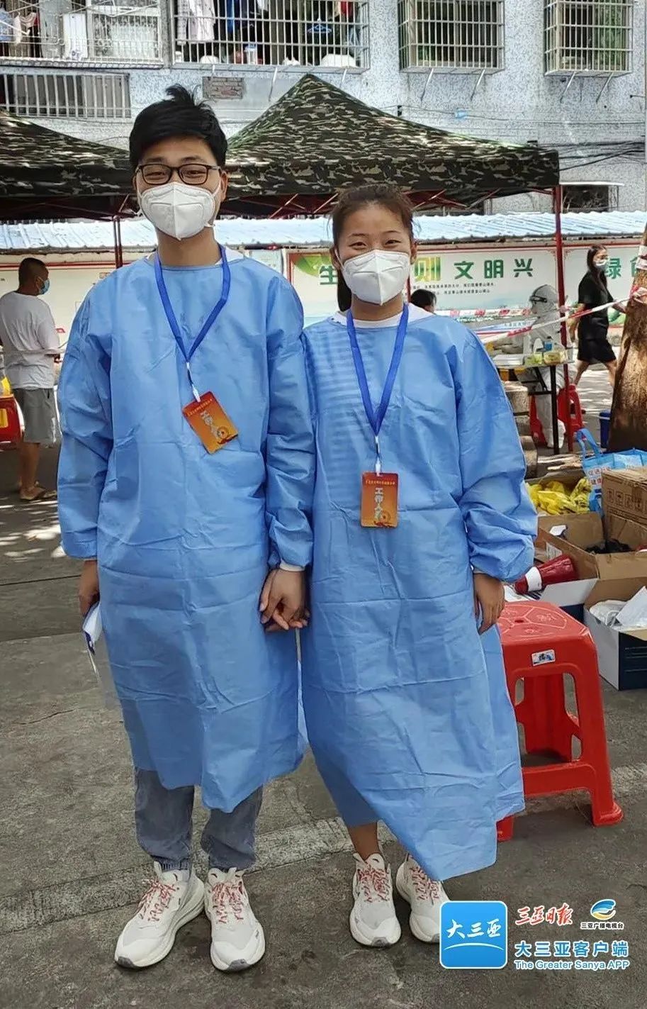 现年22岁的湛正薇来自湖北省监利市,是监利市疾病预防控制中心的一名工作人员。4月1日上午,湛正薇和男朋友胡鹏辉在三亚拍好婚纱照后,原本打算回家。新冠疫情使二人放弃了回家的计划,决定就地“找活”,报名当志愿者。两次核酸检测呈阴性后,俩人成了天涯区光明社区的疫情防控志愿者。4月3日至5日,湛正薇成为采样员,胡鹏辉则在社区采样点维护现场秩序。
