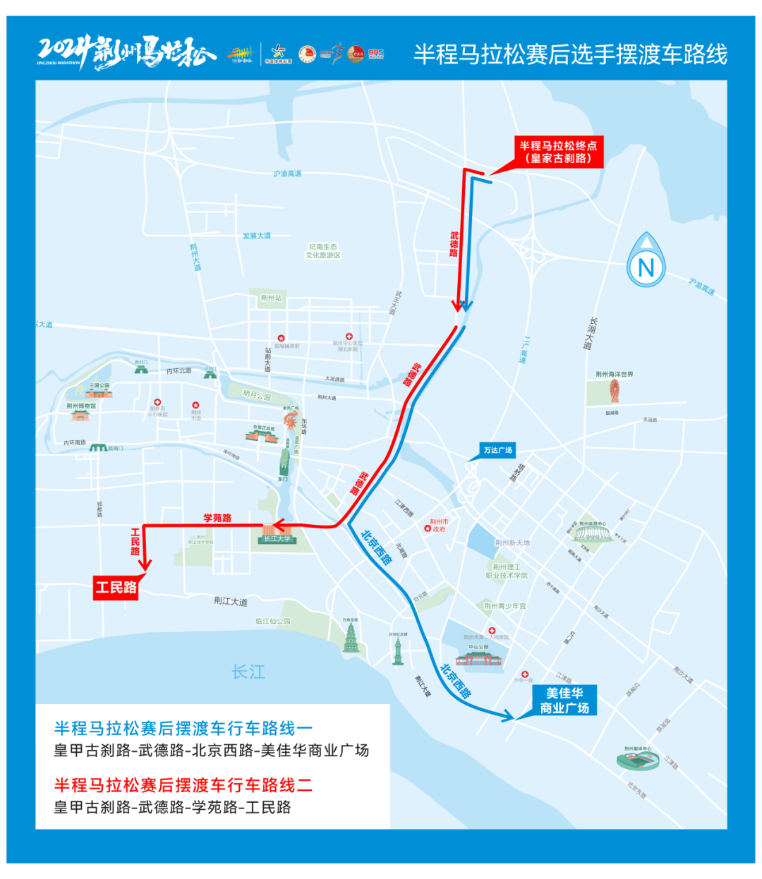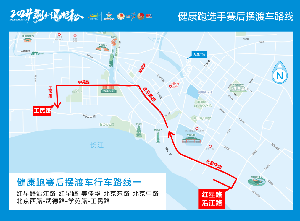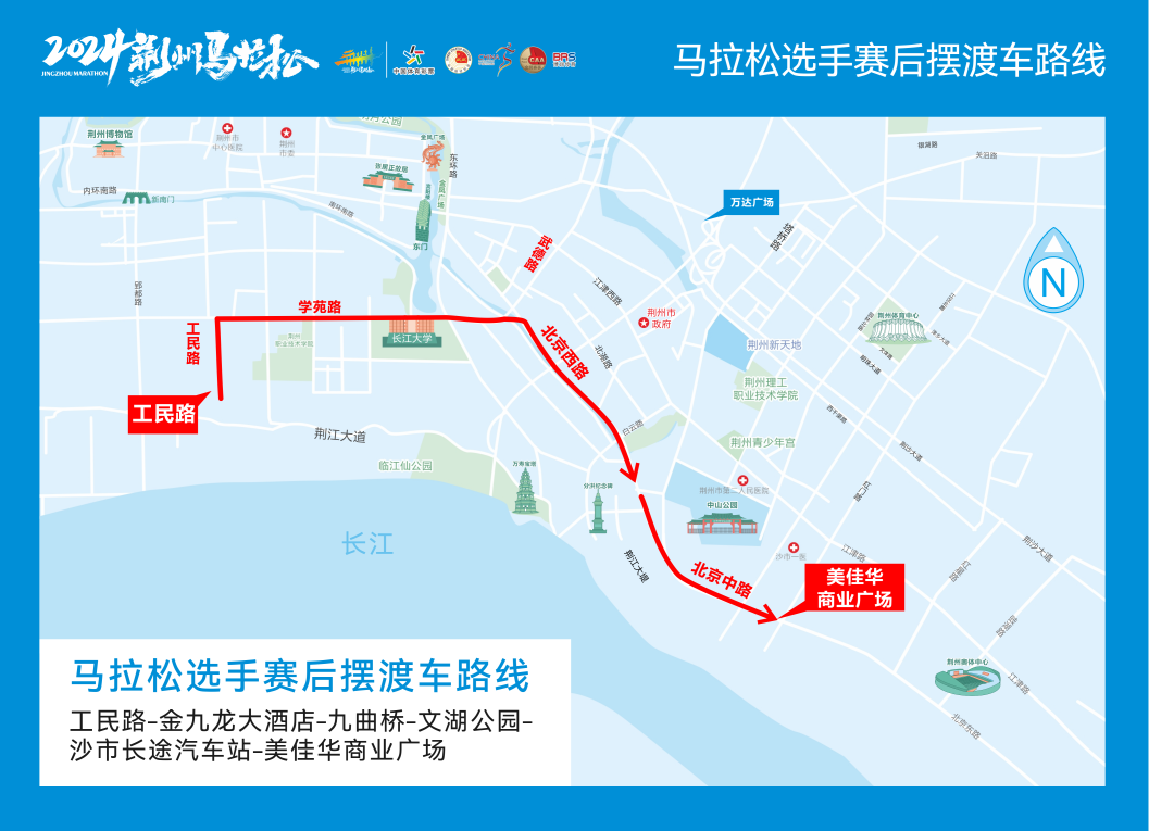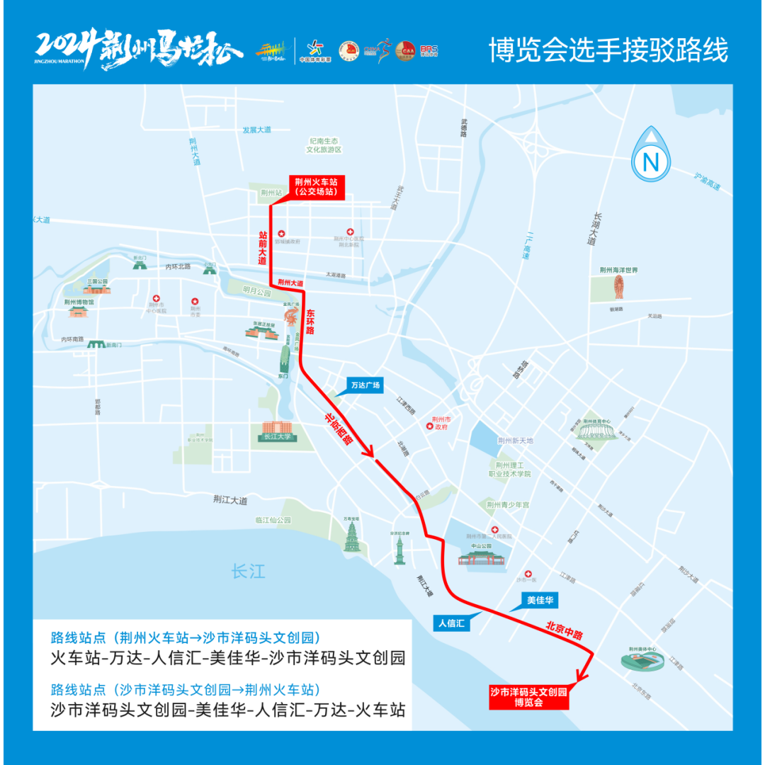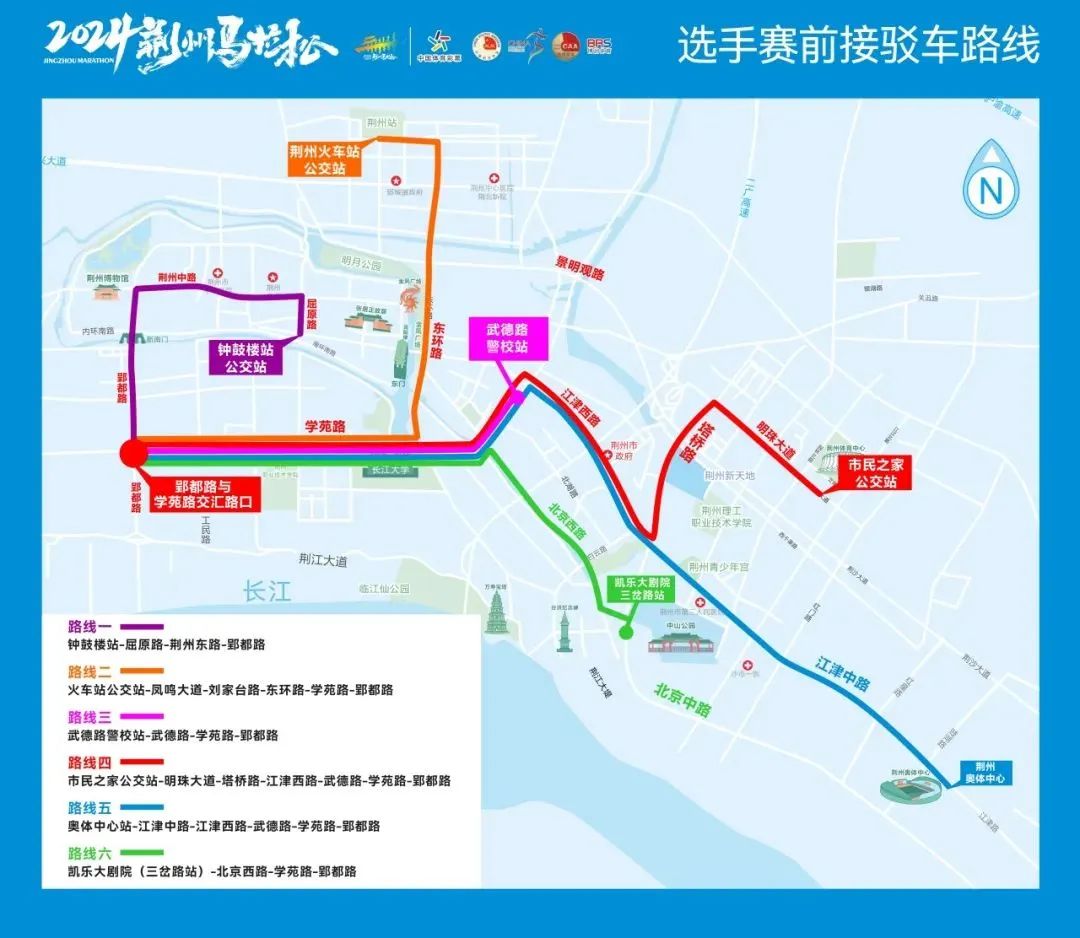 3月31日7:302024荆州马拉松将在荆州大学城中央公园鸣枪起跑为方便荆州市市民以及外来选手参赛组委会对博览会期间前来领取物品以及比赛当天参赛、完赛的选手设置了官方免费接驳专线给广大跑友提供安全、优质、便捷的出行服务具体接驳安排如下