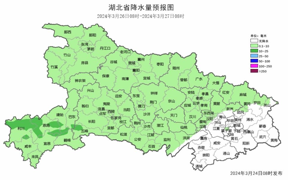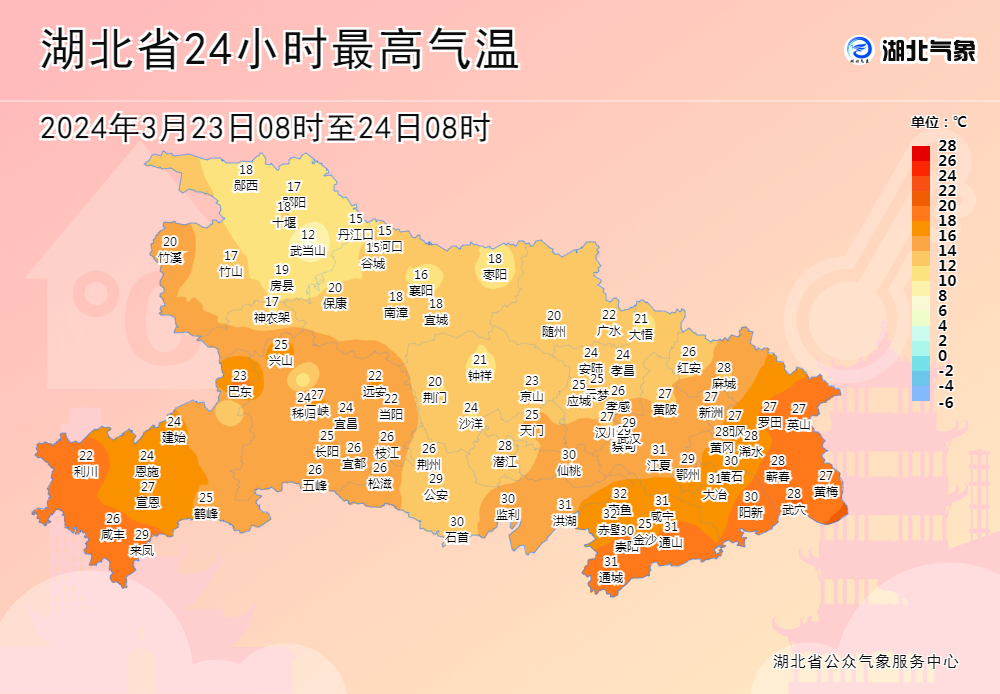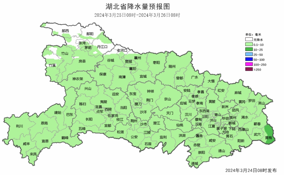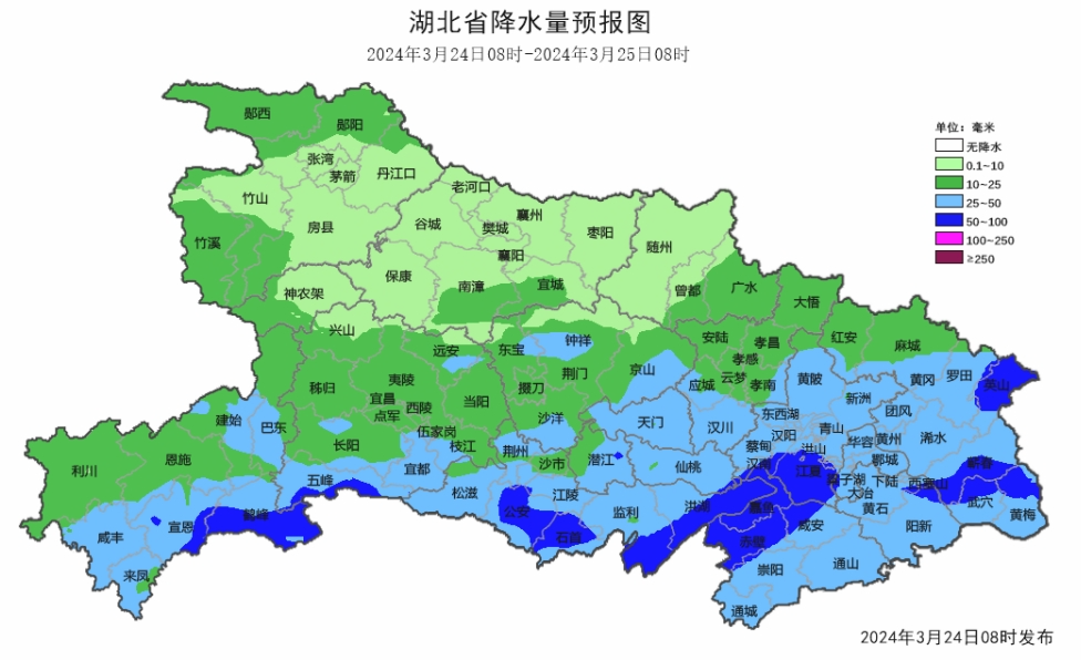 24日08时-25日08时,鄂西南、江汉平原、鄂东北、鄂东南阵雨转中到大雨,部分地区暴雨,局地大暴雨;其他地区阵雨转小到中雨。省内部分地区伴有短时强降水、雷暴大风、冰雹等强对流天气。最高气温中西部13~17℃、鄂东北19~23℃、鄂东南 25~28℃,最低气温9~13℃,偏北风4到5级、阵风7到10级。