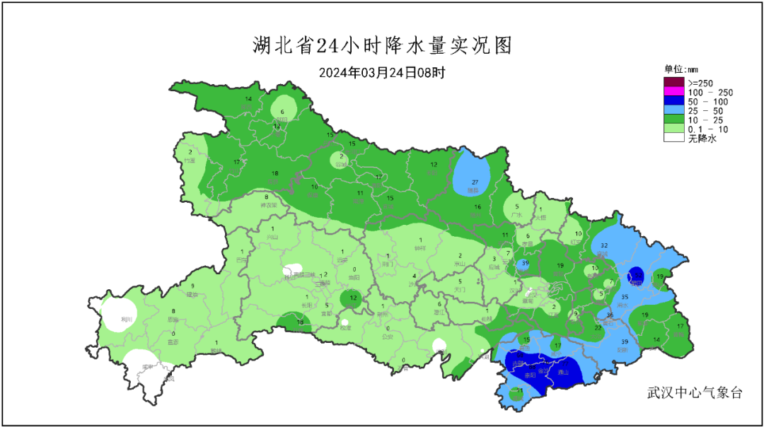 昨天(23日)07时至今日07时,湖北大部出现雷雨伴有大风和局地冰雹,东部和北部出现中到大雨,其中黄冈、咸宁等地出现暴雨,国家站中最大雨量出现在崇阳,达到87.9毫米。