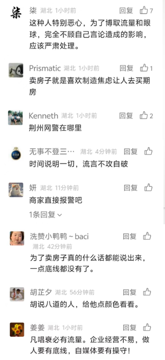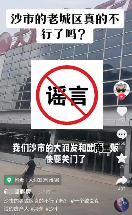 3月23日,荆州本地一从事二手房销售的自媒体大V”某哥聊房”(粉丝3万)在某平台上发布视频,称“沙市的大润发和武商量贩超市快要关门了,沙市的老城区真的不行了吗”,造谣称荆州城区继某连锁超市暂停营业后,又将有多家大型超市即将倒闭。相关消息引起公众恐慌和质疑,帖文点击浏览量超过10万次,转发评论量超千条。