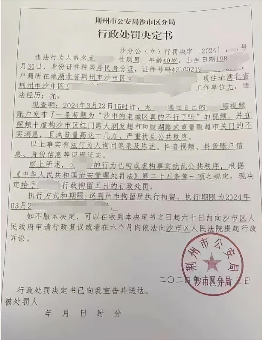 荆州市网安支队在发现该舆情后,立即对发帖账号进行调查,很快查明发帖人真实身份为龙某,男,41岁,沙市区人。并将线索通报移交给沙市区公安分局。沙市分局高度重视,立即指令辖区派出所受案,传唤造谣嫌疑人到案。经讯问,龙某对其为博取眼球、吸引流量,无端编造荆州又有多家大型超市即将倒闭的行为供认不讳。沙市分局经法制部门审核,认定其行为已构成虚构事实扰乱社会公共秩序的违法行为,依法对嫌疑人龙某给予行政拘留的处罚。