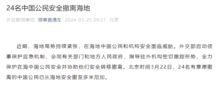 据“领事直通车”25日消息,近期,海地局势持续紧张,在海地中国公民和机构安全面临威胁。外交部启动领事保护应急机制,会同有关部门和地方人民政府,指导驻外机构密切跟踪形势,全力保护在海中国公民安全并协助他们安全转移撤离。北京时间3月22日,24名有意愿撤离的中国公民已从海地安全撤至多米尼加。