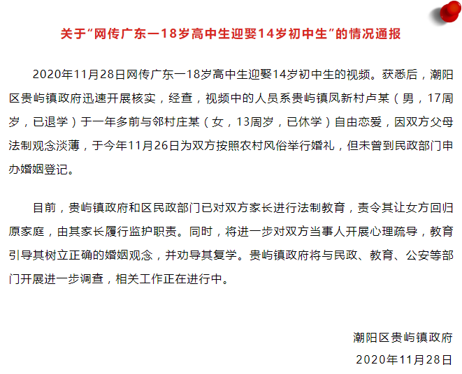 11月29日1时9分,广东省汕头市潮阳区贵屿镇政府发布情况通报:经查,视频中的男孩17周岁,女孩13周岁,双方自由恋爱,因双方父母法制观念淡薄,于11月26日为双方按照农村风俗举行婚礼,但未曾到民政部门申办婚姻登记,责令其让女方回归原家庭。