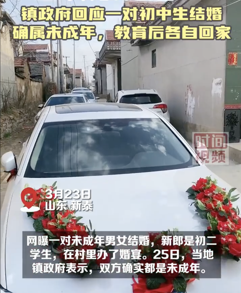 3月23日,网曝山东新泰一对未成年男女结婚,新郎是初二学生,在村里办了婚宴。消息一出,随即引发网友广泛关注。25日,当地镇政府表示,双方确实都是未成年。