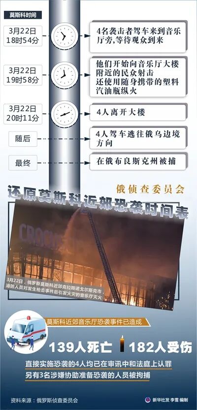 俄罗斯侦查委员会主席巴斯特雷金25日向总统普京汇报说,莫斯科近郊音乐厅恐袭事件已造成139人死亡、182人受伤。他详细还原了此次袭击的时间表。