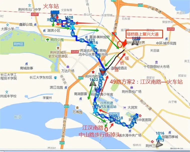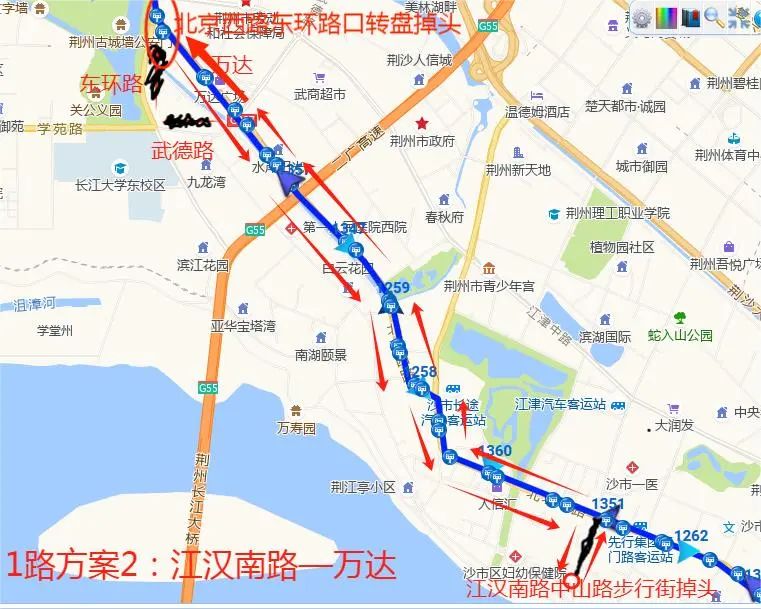55路:红星路转盘—岑河农场,途经路段:红星路—北京路—鱼龙路—东方大道—荆沙大道—深圳大道—曙光路;