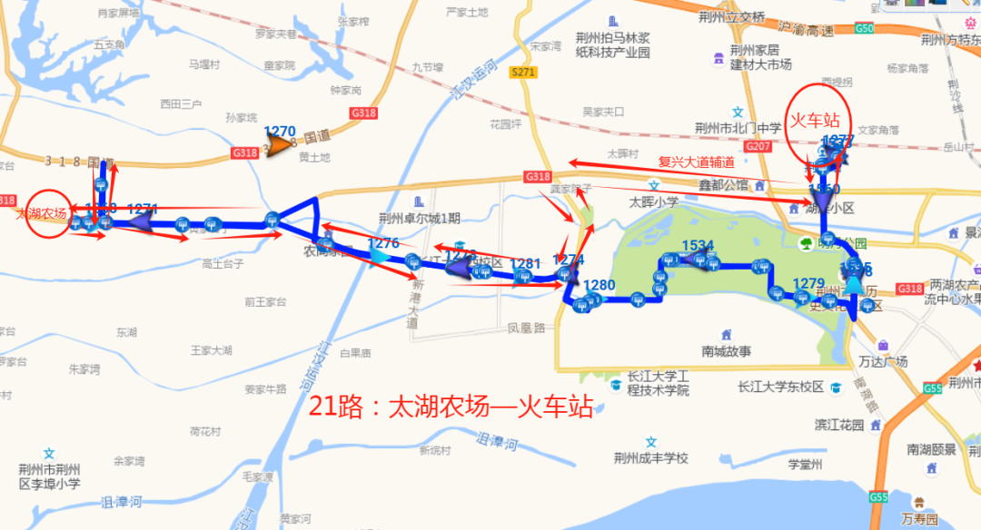 21路:火车站—太湖农场,途经路段:集智路—凤鸣大道—庄王大道—复兴大道辅道(北环路)—西环路—荆秘路—太湖大道—318国道(清流路);