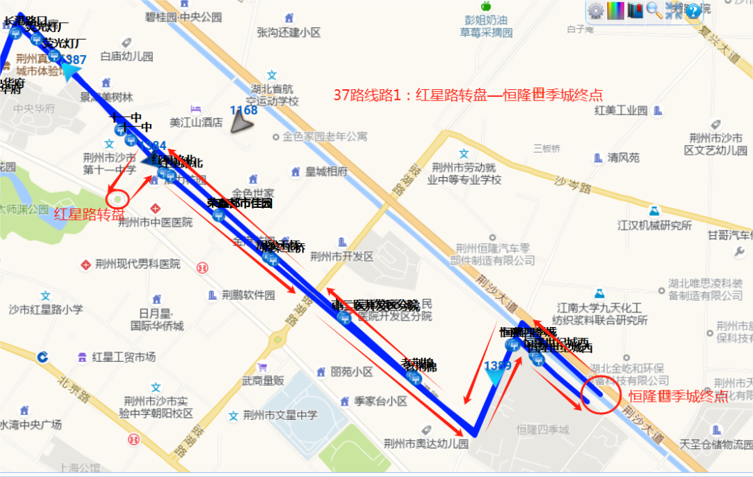 18路线路1:西门—黄金堂,途经路段:荆中路—屈原路—荆南路—黄金堂路—荆东路—荆中路;