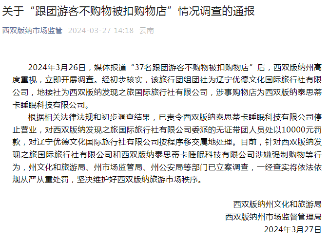 3月27日,云南西双版纳市场监督发布关于“跟团游客不购物被扣购物店”情况调查的通报,全文如下: