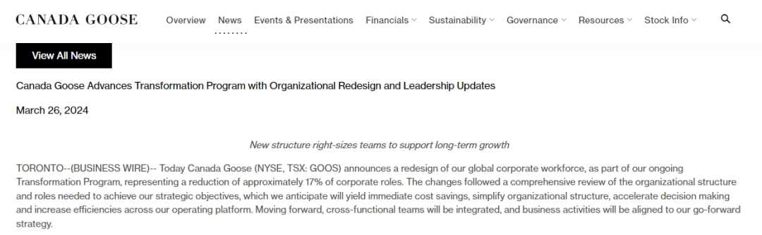 当地时间3月26日,知名奢侈品牌加拿大鹅(Canada Goose)发布重大消息,作为“转型计划”的关键步骤,该公司决定在全球范围内进行裁员,涉及员工比例约17%。这一举措旨在立即降低成本、优化组织结构、加速决策流程,并全面提升整体运营效率。