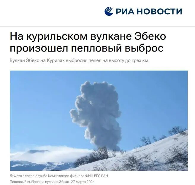据俄新社介绍,埃别科火山高1156米,坐落在维尔纳茨基岭北部的帕拉穆希尔岛上。自2016年10月以来,埃别科火山经常喷发(从弱喷发到中度喷发),这是该火山的正常活动。2018年8月31日记录到其最大喷发,当时一个新火山口喷出的烟柱冲到6000米高度。