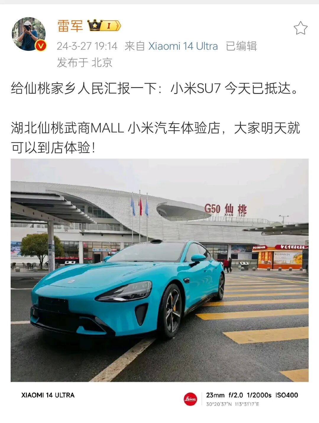 “给仙桃家乡人民汇报一下小米SU7 今天已抵达湖北仙桃武商MALL 小米汽车体验店大家明天就可以到店体验!”