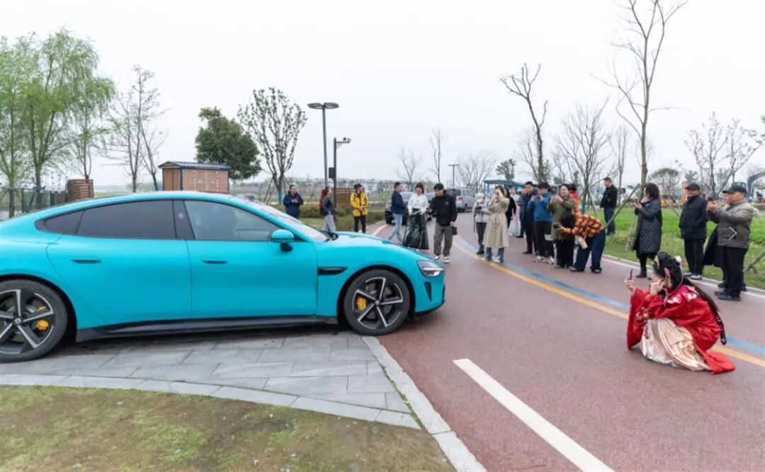 据极目新闻记者了解,3月27日,海湾蓝配色的小米SU7抵达仙桃,先后前往沔阳小镇景区、荆楚云天海世界、密塘渔村进行巡游,其间一直被仙桃“米粉”们热情围观。