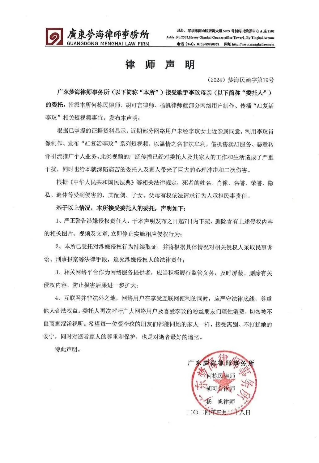 据广东梦海律师事务所网站,该所接受李玟母亲的委托,指派何栋民律师、胡可言律师、杨帆律师就部分网络用户制作、传播“AI复活李玟”相关短视频发布本律师声明。具体内容如下: