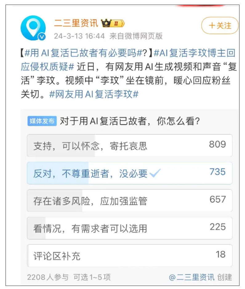 法治日报此前发文称,有专业律师表示,法律除保护生者的人格权外,对死者的人格权益亦加以保护。对此,民法典第九百九十四条明确规定了死者的姓名、肖像、名誉、荣誉、隐私、遗体等受到侵害的,其配偶、子女、父母有权依法请求行为人承担民事责任。故未经逝者亲属等同意的情况下,用AI“复活”李玟等行为涉嫌侵权,逝者配偶、子女、父母有权依法请求行为人承担民事责任;若逝者没有配偶、子女且父母已经死亡的,其他近亲属有权依法请求行为人承担民事责任。