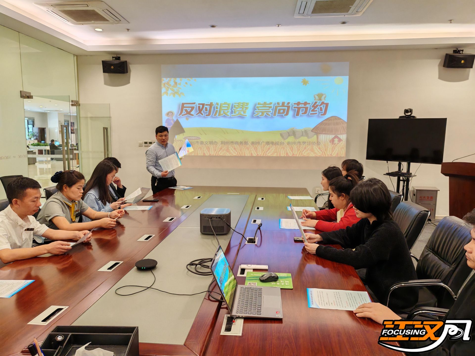 在吾悦广场会议室,荆州商务局相关负责人讲解了相关法律法规中有关制止餐饮浪费的内容,并向现场餐饮行业从业者们强调,如未主动对消费者进行制止浪费提醒,将面临行政警告处罚。