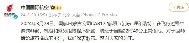 3月30日,中国国际航空就“CA8122航班遭遇颠簸”致歉,声明全文如下:
