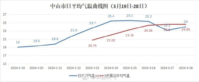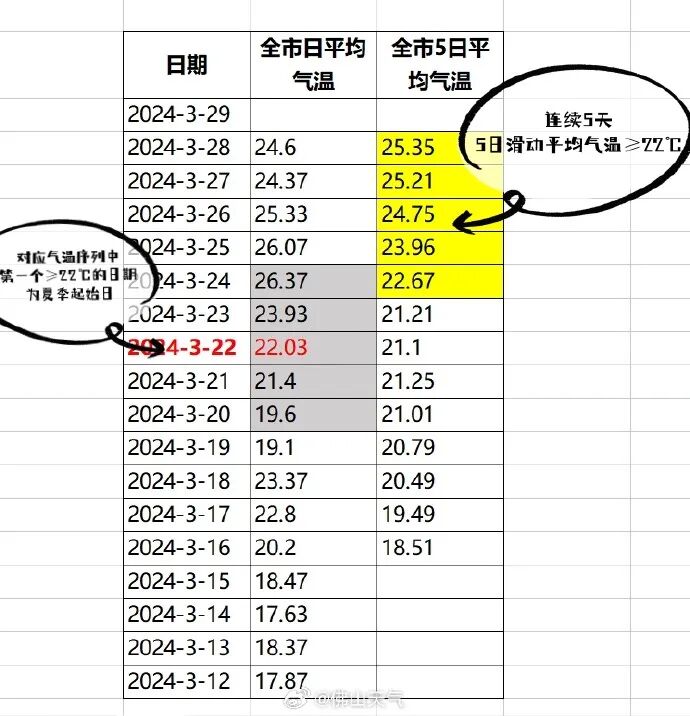 29日,据@中山天气,自3月24日起,已有5组的五天滑动平均气温高于22℃,在该序列中,3月23日平均气温大于22℃,所以中山于3月23日正式进入夏季,比常年入夏日(4月9日)早17天。