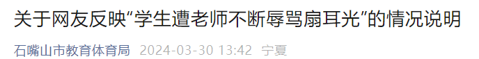 3月30日,宁夏石嘴山市教体局通报“学生遭老师不断辱骂扇耳光”:已对涉事教师作出开除处理。