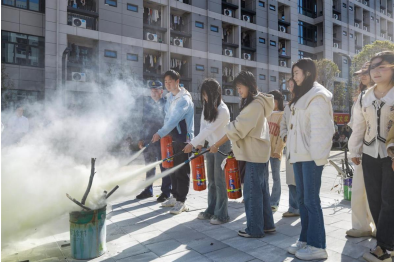 在紧急疏散演练中,同学们捂住口鼻并弯腰,按照既定路线有序撤离,教学楼层、楼梯口安排的“火焰蓝”大学生志愿者进行疏导工作。在消防装备展示区,消防救援人员向师生们展示各种消防装备,对常用灭火器使用方法详细讲解,现场的学生们积极参与实操使用。