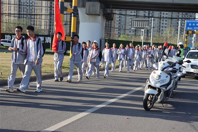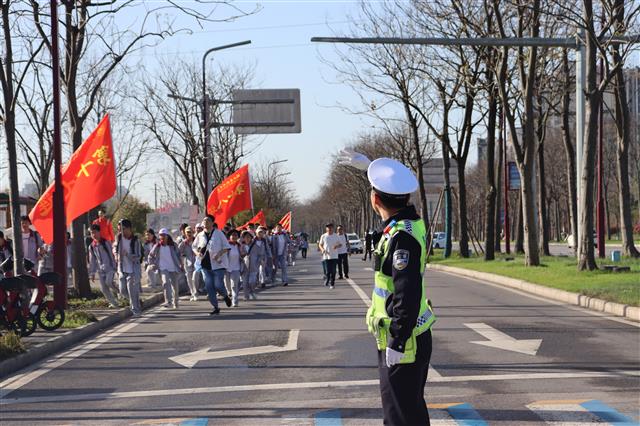 在执勤民辅警的护送下,远足队伍浩荡前行,始终保持井然有序。上午11时许,顺利抵达实践地园博园。