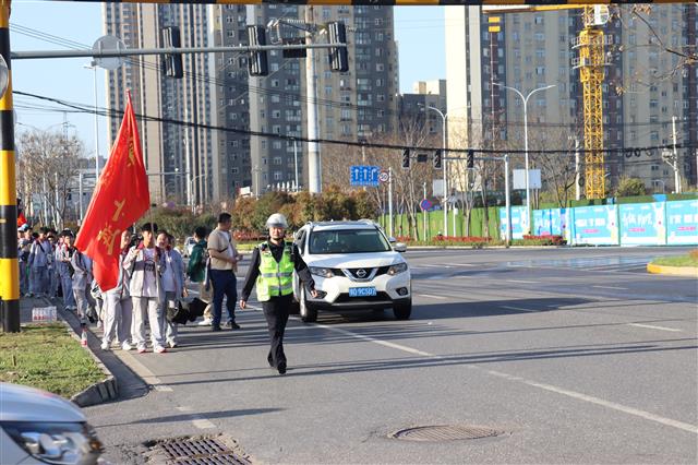 江汉风报道:3月29日,荆州中学组织高一年级全体师生开展远足拉练活动。为确保活动顺利开展,荆州市公安局交管局五大队民辅警身着荧光绿现身,全程护送,为师生远足打造“平安路”。