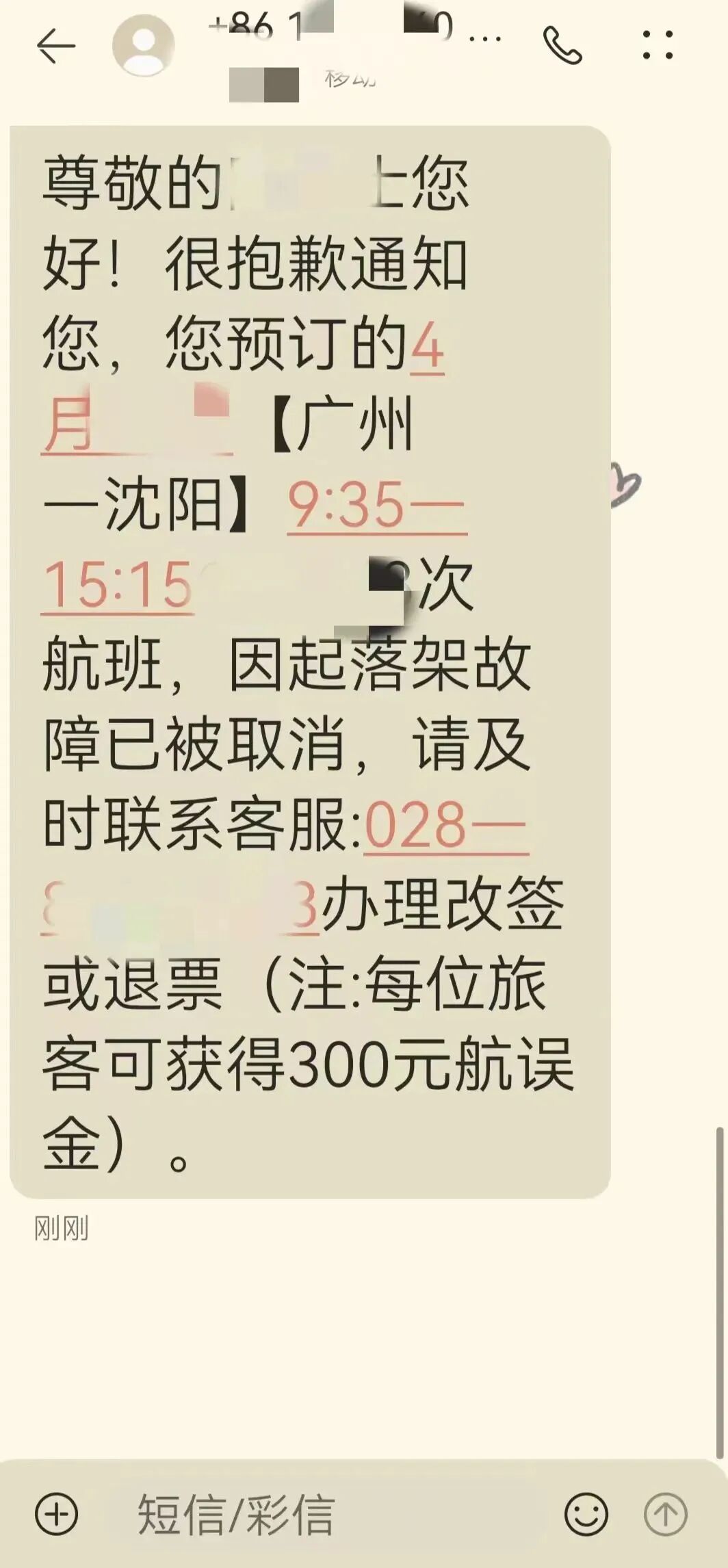 陶女士计划和家人去沈阳旅行,便提前预订了从广州飞往沈阳的航班,但就在出发的那天凌晨,陶女士突然收到了一条短信:“尊敬的XX您好!很抱歉通知您,您预订的4月X日【广州—沈阳】9:35—15:15XXX次航班,因起落架故障已被取消。请及时联系客服:XXXX办理改签或退票(注:每位旅客可获得300元航误金)”。