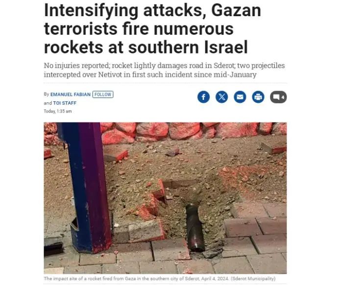 据《以色列时报》报道,当地时间4日晚,以色列国防军表示,以色列南部城市斯代罗特遭加沙地带发射的两枚火箭弹袭击。