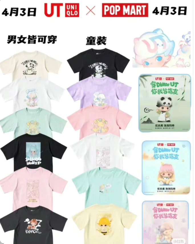 4月3日,优衣库泡泡玛特联名T恤发售,单笔订单购买4件“任意泡泡玛特UT商品”就有机会获赠合作手办1个。