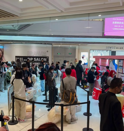 3月29日,名创优品与Chiikawa主题快闪全国首站登陆上海静安大悦城,吸引了众多粉丝前来,甚至有人前一天22点多就来排队,还有人带着被子来。3月29日当天10小时狂销268万元,创静安大悦城IP展单日最高销售纪录。