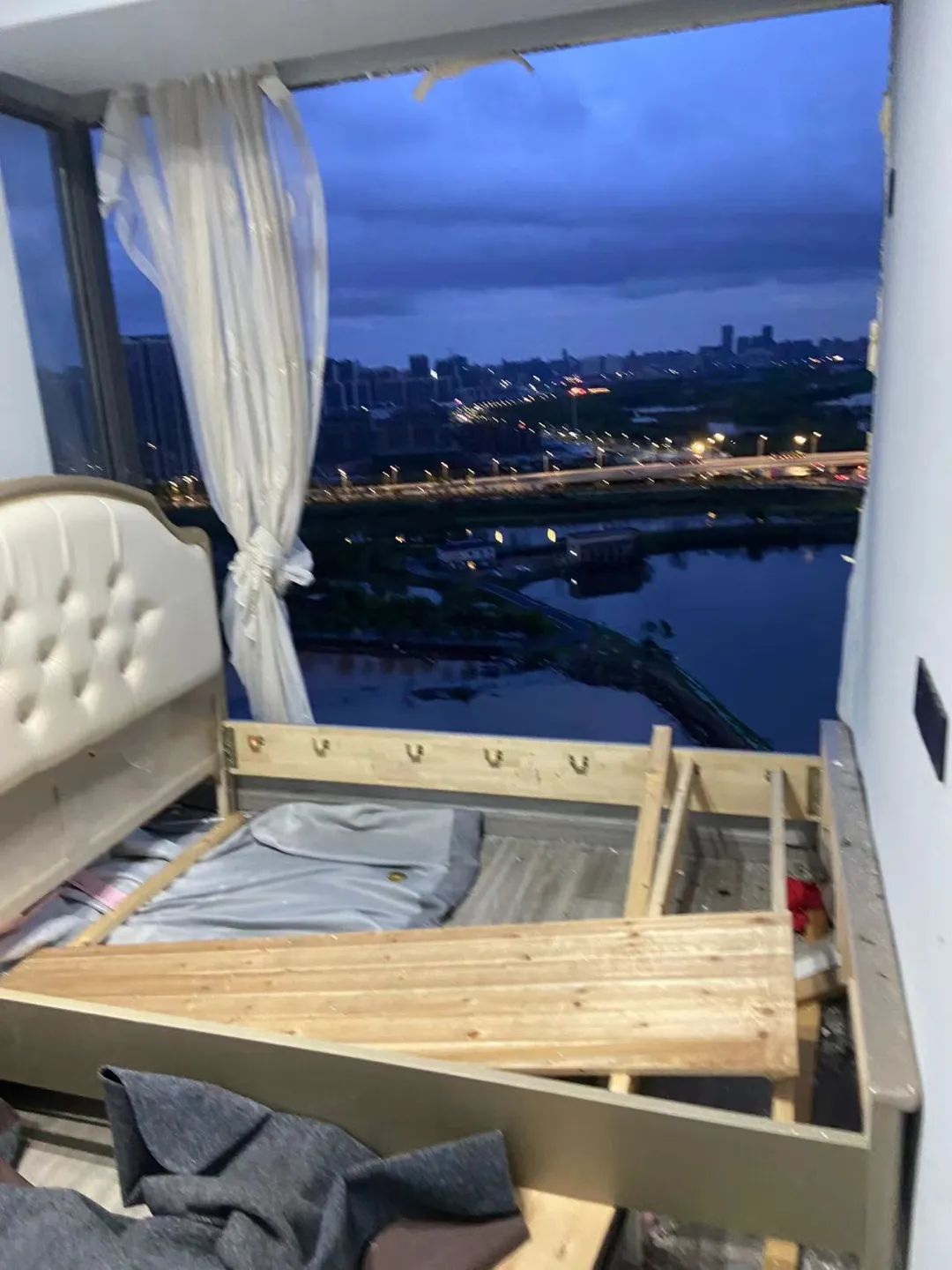 2时58分左右,她被风雨惊醒时,睡在次卧的儿子和婆婆已经不见了。整扇窗户连着窗框、天花板、床垫、床头柜,一起消失了。卧室破了一个大洞,风呼呼往里灌。