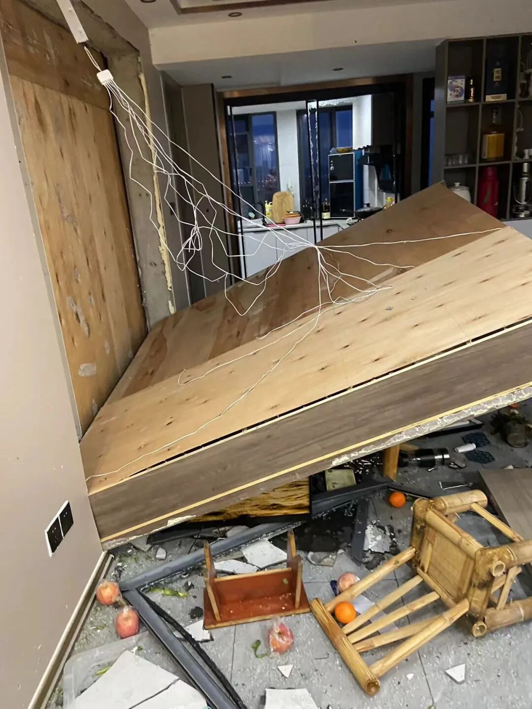 强风过后,张黎家客厅的柜子被吹坏。受访者供图