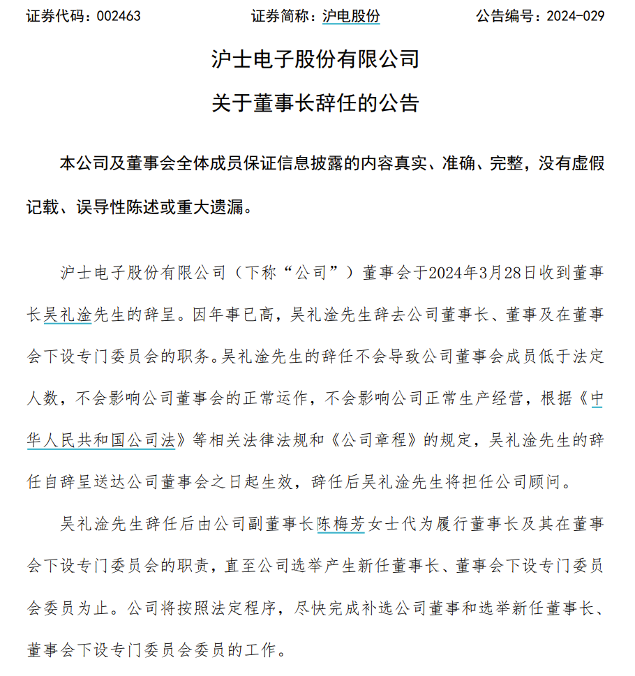 而就在3月28日晚间,沪电股份才刚发布公告宣布吴礼淦辞任公司董事长一职,公告称,董事会于2024年3月28日收到董事长吴礼淦先生的辞呈。因年事已高,吴礼淦先生辞去公司董事长、董事及在董事会下设专门委员会的职务。