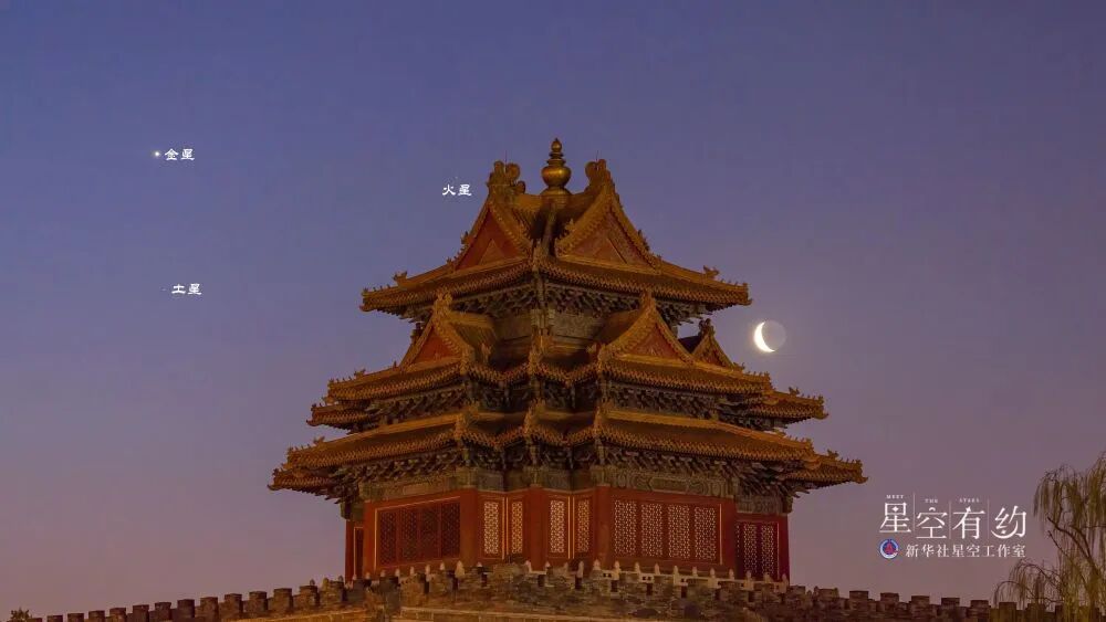 北京星空摄影爱好者吴鲁萍2022年3月28日清晨在北京拍摄的金星、火星、土星与残月。(拍摄者供图)