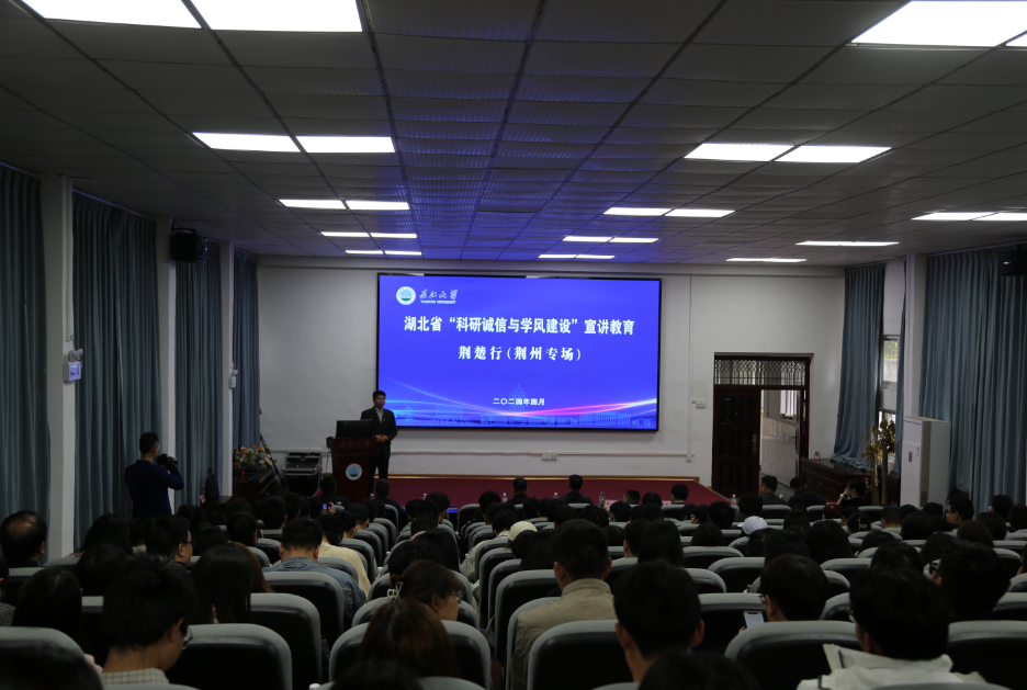 江汉风报道:为贯彻落实习近平总书记关于学风建设和科研诚信建设工作重要指示精神,引导广大师生、科技工作者弘扬科学家精神,涵养优良学风,增强恪守科研诚信和科研伦理规范的思想自觉行动自觉,共同营造风清气正的学术生态。4月11日下午,由湖北省科学技术协会、湖北省科技厅主办,荆州市科学技术协会、荆州市科技局协办,长江大学承办的湖北省首场“科研诚信与学风建设”宣讲教育荆楚行(荆州专场)活动在长江大学国际交流学术报告厅举行。中国地质大学(武汉)教授、博士生导师陈刚应邀作宣讲报告。省科技厅、省科协、市教育局、市科协、长江大学、湖北中医药高等专科学校、荆州职业技术学院有关领导以及青年教师、学生代表230多人聆听报告会。