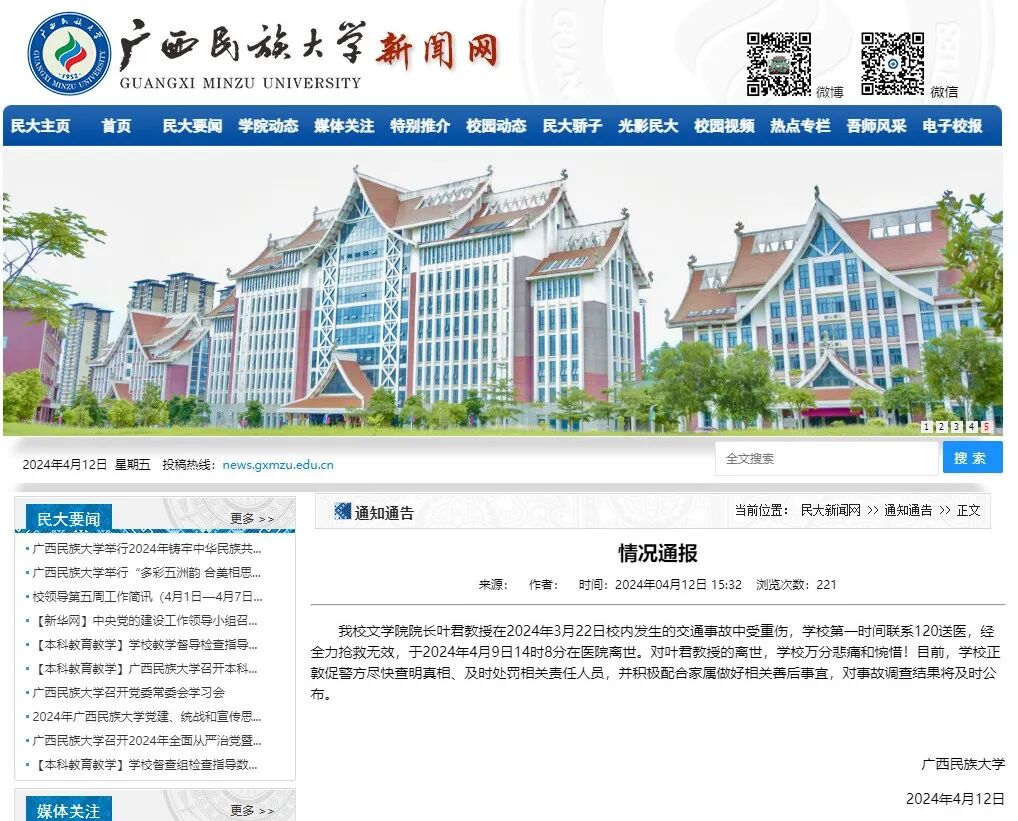 今天(4月12日)下午,广西民族大学新闻网发布情况通报:我校文学院院长叶君教授在2024年3月22日校内发生的交通事故中受重伤,学校第一时间联系120送医,经全力抢救无效,于2024年4月9日14时8分在医院离世。对叶君教授的离世,学校万分悲痛和惋惜!