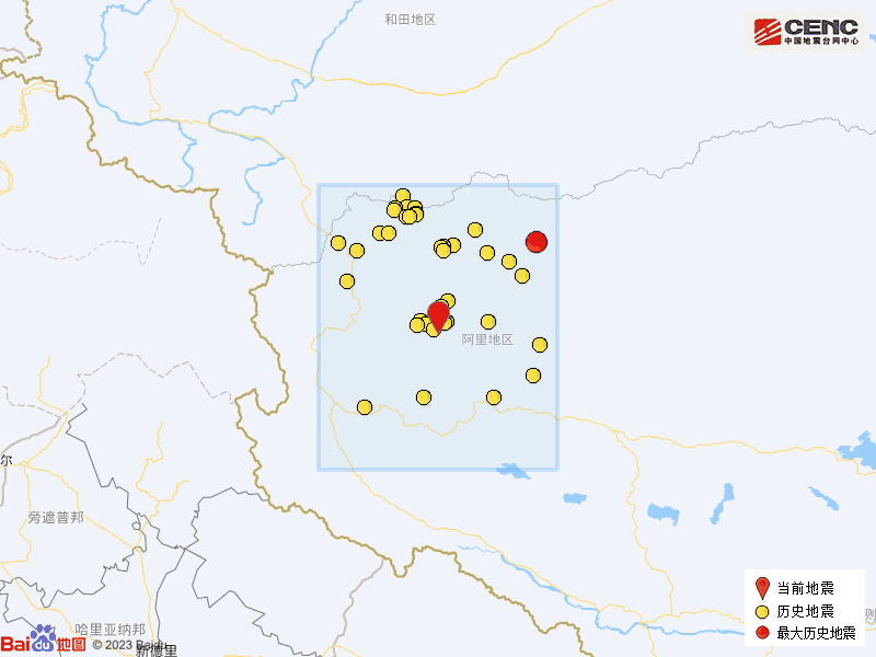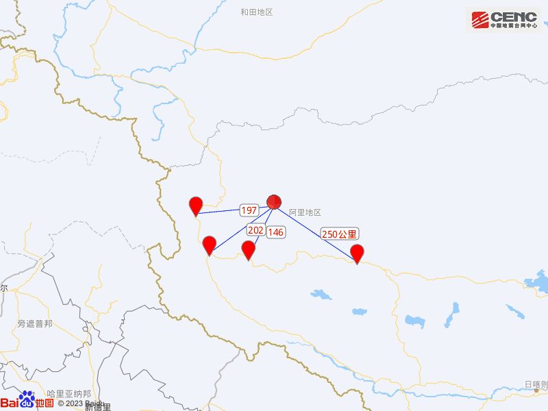 周边县城:震中距革吉县146公里、距日土县197公里、距噶尔县202公里、距改则县250公里,距阿里地区200公里,距拉萨市981公里。